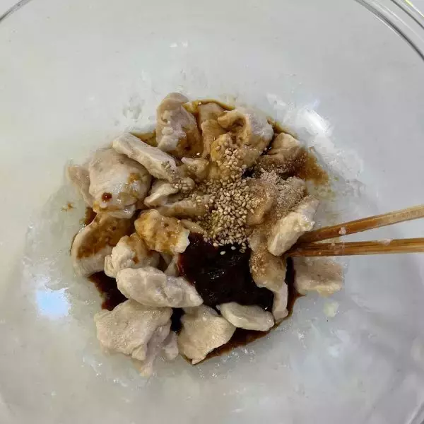 加熱した鶏胸肉の入ったボウルに混ぜ合わせたたれを入れた様子