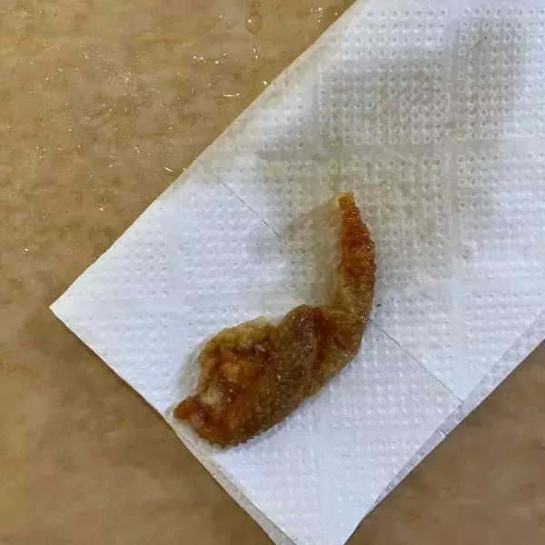 カリカリになった鶏皮の余分な油をキッチンペーパーで吸った様子