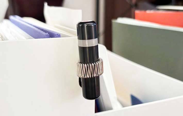 続いて、会社や家庭で使用頻度の高い印鑑。特に認印のような細身の印鑑なら、このホルダーにぴったり収まります。
