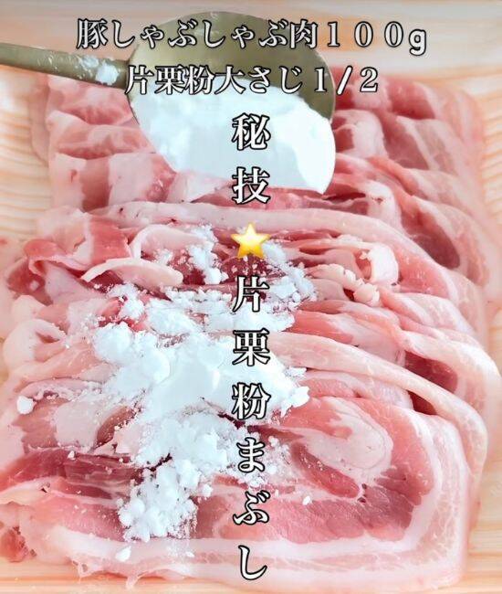 豚肉に片栗粉をまぶしましょう。倉嶋さんいわく、片栗粉をまぶすことで、ゆでてもしっとりさをキープできるそうです。