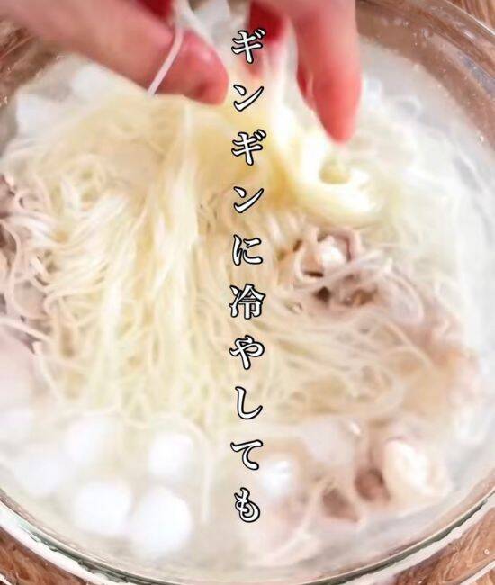 そうめんと豚肉を一気に冷水でしめてください。大胆に感じる工程ですが、2回お湯を沸かさなくて済むので、手間を省けます。