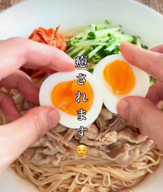 ムラなく混ざったら、豚肉を上に移動させ、キュウリやキムチ、ゆで卵などをトッピングしてください。トッピングは、オクラやトマト、納豆などもおすすめですよ。
