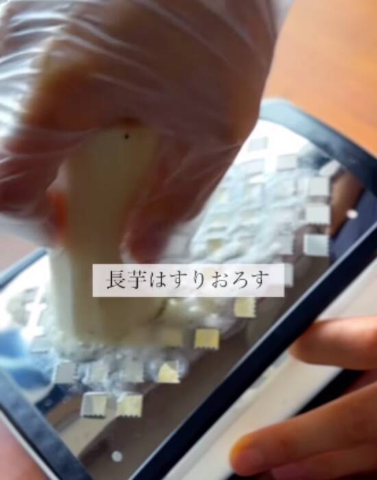 次に長芋の皮をむき、すりおろしてください。