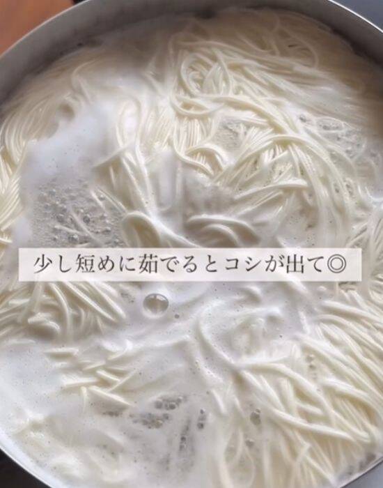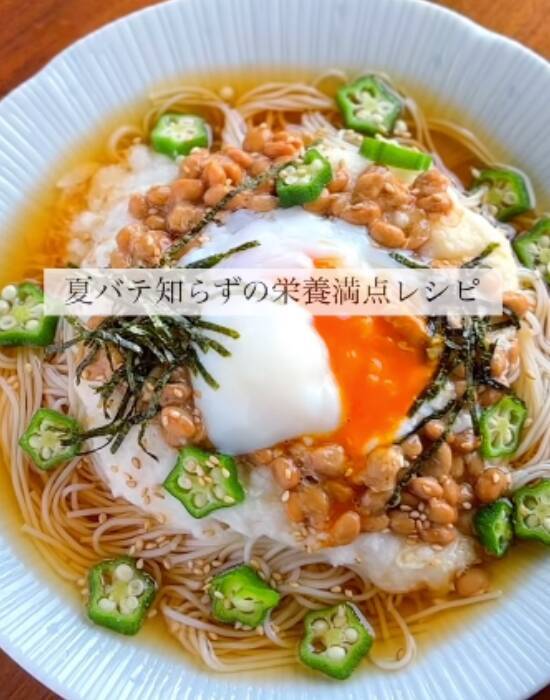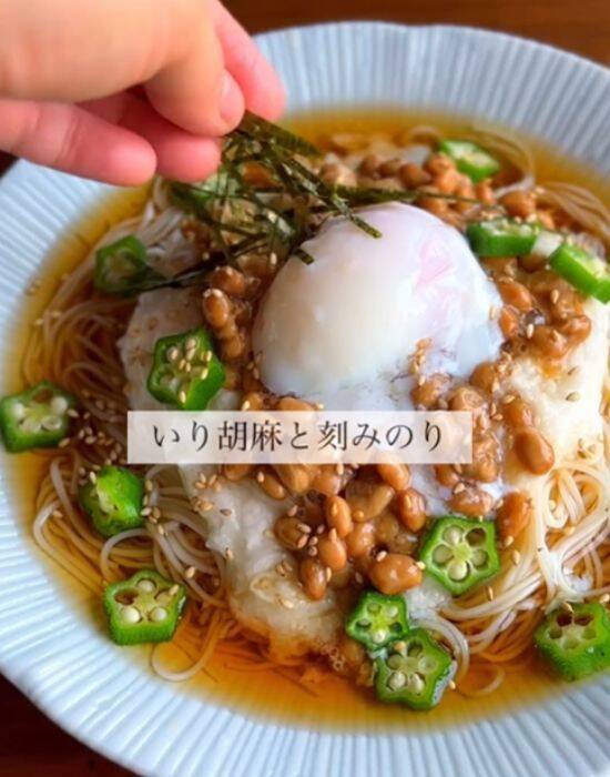 そこで本記事では、Instagramで時短レシピを発信している料理研究家、北村みゆき(miyuki.recipe)さんの2025年7月10日の投稿から、『温玉とろろオクラ納豆そうめん』の作り方を紹介します。