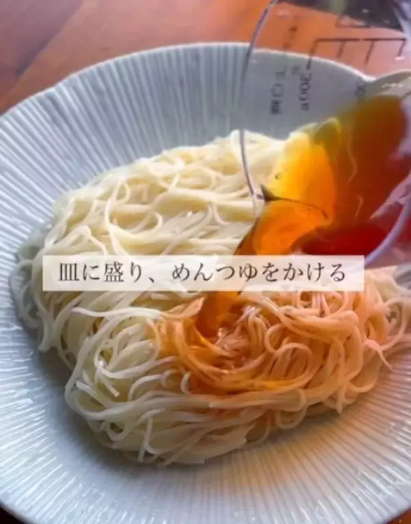 そうめんにめんつゆをかけている様子