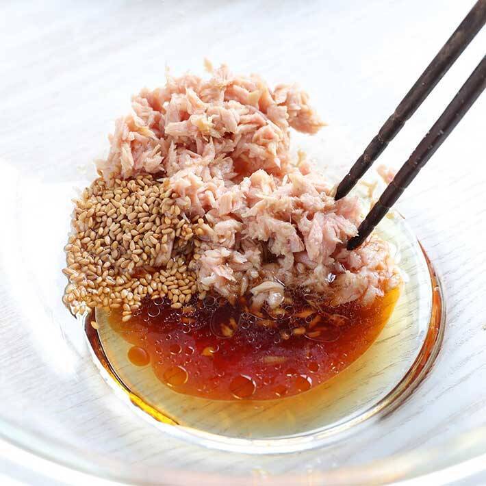 ボウルに『A』の材料を入れて混ぜたら、油を切ったツナも入れましょう。