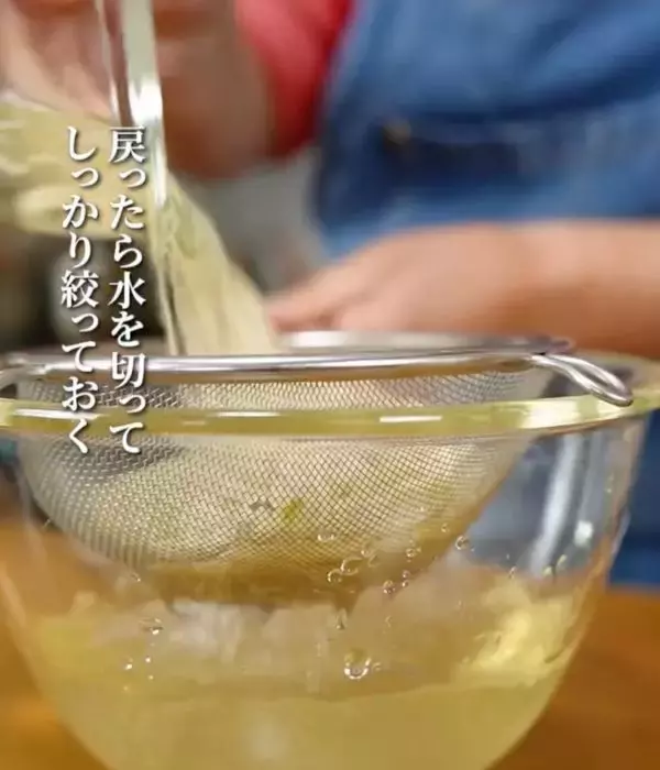 水で戻した切り干し大根をザルに移して水気を切る様子