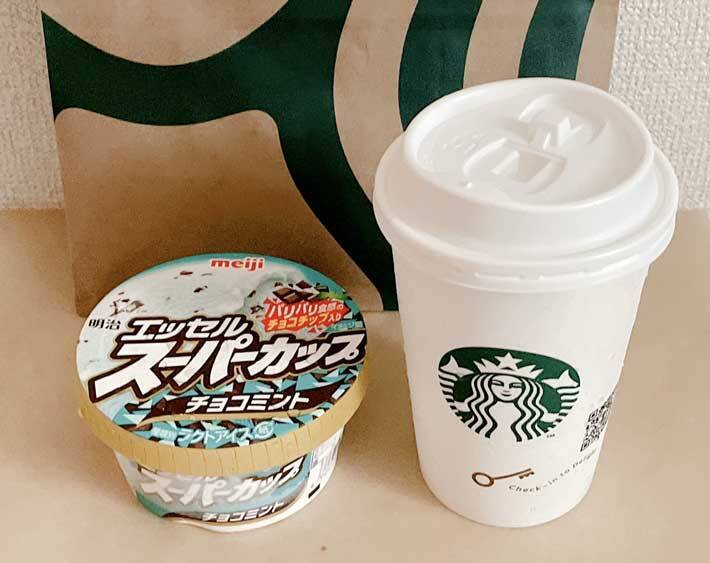 用意したのは、トールサイズの『スターバックスラテ』と『明治 エッセル スーパーカップ(以下、スーパーカップ)』のチョコミント味です。