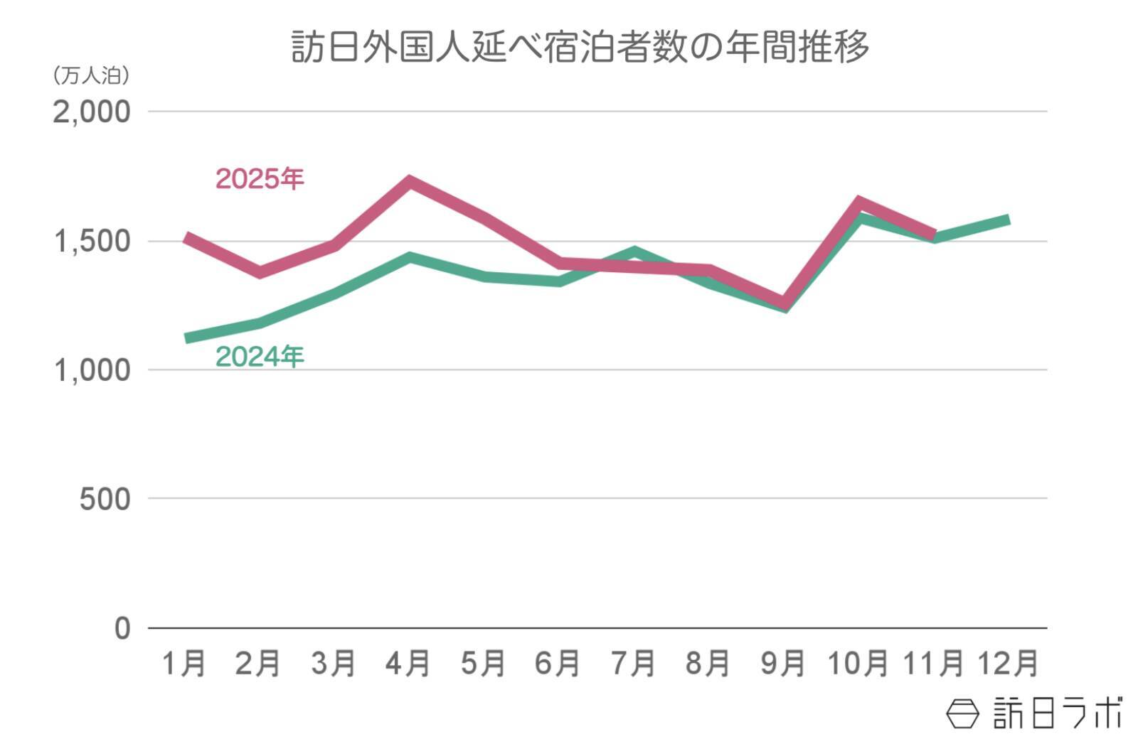観光庁は、2025年11月の延べ宿泊者数(第1次速報)を公表しました。