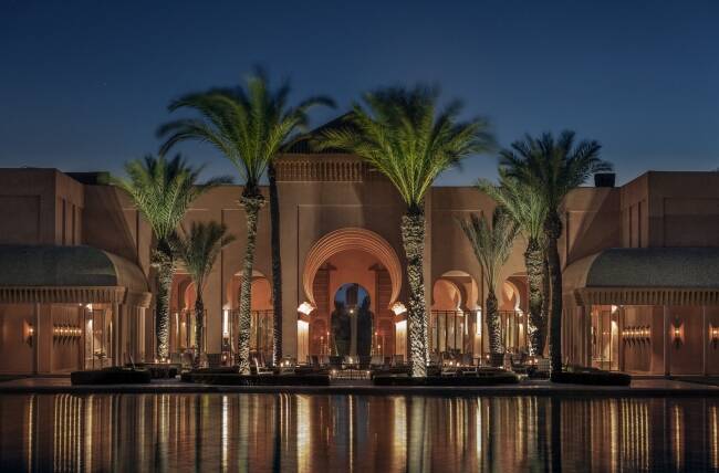 アマンジェナ(平和なる楽園)は、古代都市、マラケシュの郊外に佇むアフリカ大陸で最初のアマンのリゾートとして誕生。ナツメヤシやオリーブが群生するオアシスに位置し、古代のバサンと呼ばれ巣池に映し出されるスルタン宮殿様式のパビリオンや、小石を敷き詰めた壁が特徴のムーア様式建築で統一されたホテル。中央に天窓を備え、プールと庭園の眺めを望む、開放感あふれるエレガントなレストラン。