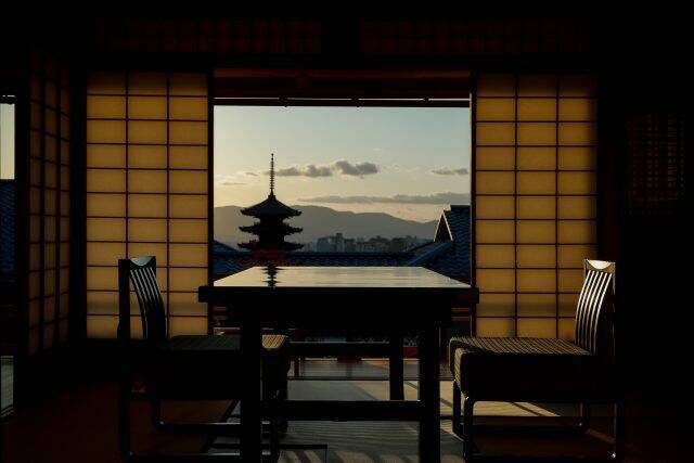 京都市街と八坂の塔を同時に眺望する同ホテルは、明治10年創業の料亭「山荘 京大和」と共生。庭と家屋が一体化する「庭屋一如(ていおくいちにょ)」の造りが、東山のいにしえの記憶と四季の移ろいを語る。