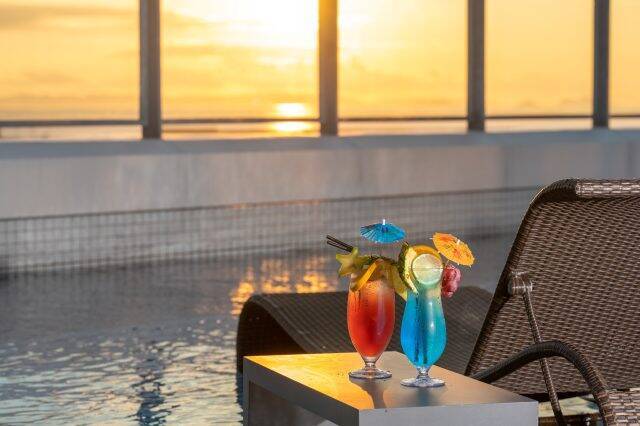 沖縄県那覇市にある「HOTEL SANSUI NAHA(ホテル サンスイ ナハ)」は、海と空が一体となる最上階のスカイプールエリアにルーフトップバーをオープンし、ナイトプールの営業も行う。