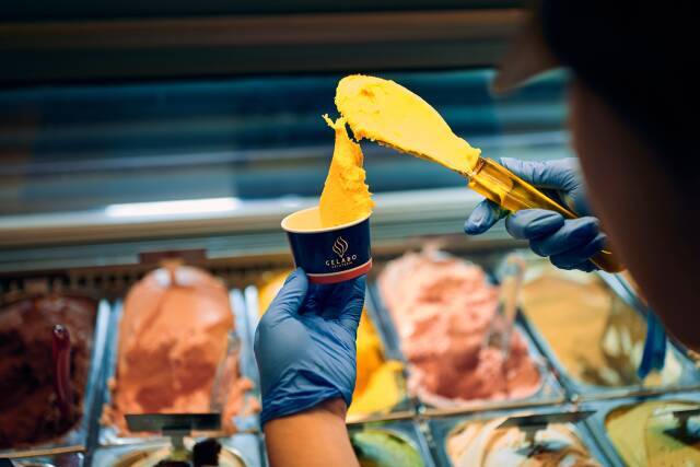赤井川村山中牧場の低温殺菌牛乳と、ピューレなどは使わず、旬のフルーツを1つ1つ職人が皮を剥くところから作るジェラートは、とても濃厚な味わい。