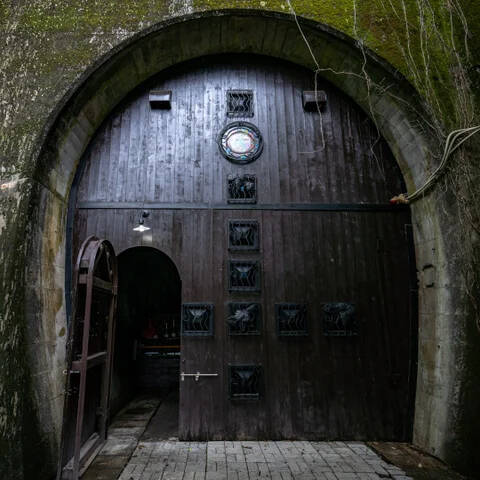 3万本もの酒類を熟成させている熟成庫は、地中1,000mのトンネル内にあり、年間を通して一定の温度環境を保つという熟成に最適な環境を特徴とする。