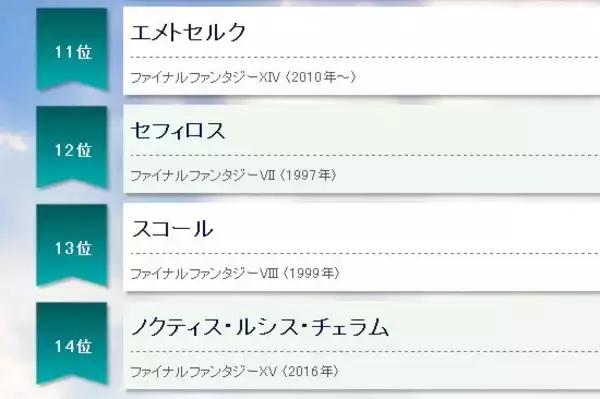 また、『FFVII』の「セフィロス」は12位に。同作に登場する面々の中でも特に人気があるキャラだけに、意外な結果と思う方もいるのでは。ちなみに『FFVII』からは、「ユフィ」が28位に入っています。