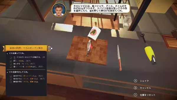 最初の注文は「マスのオーブン焼き」。最初にしては難しそうな注文ですね。先程並べたスパイスを振って、それをオーブンで焼いている間にレモンを切り……と、なかなか忙しい。