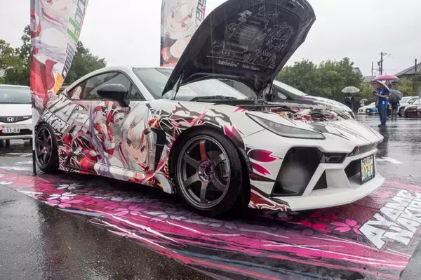 集まった痛車・痛バイクは約150台。残念ながら天候には恵まれず、あいにくの雨模様となりましたが、それでも自分の愛するクルマとキャラクターを持ち込んだ参加者で会場は大きな盛り上がりを見せていました。