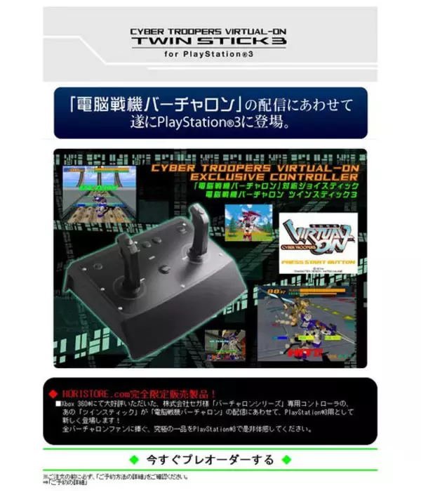 今回は『電脳戦機バーチャロン』に合わせた発売ということで、Xbox360はもちろんPS3用の発売も決定しています。限定生産のため、購入希望者は10月17日17時~10月29日17時までの期間内にプレオーダーページより仮予約を行う必要があります。また、商品化可能な数量に達しない場合は発売自体が中止となるので注意してください。