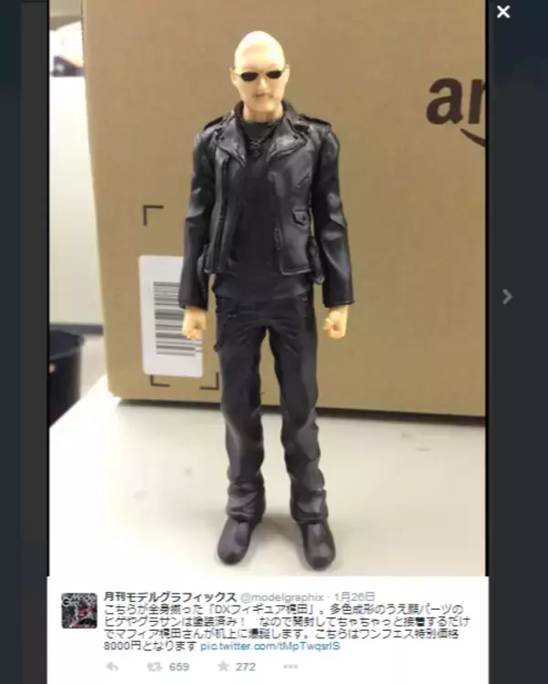 こちらが全身揃った「DXフィギュア梶田」。多色成形のうえ顔パーツのヒゲやグラサンは塗装済み! なので開封してちゃちゃっと接着するだけでマフィア梶田さんが机上に爆誕します。こちらはワンフェス特別価格8000円となります pic.twitter.com/tMpTwqsrlS- 月刊モデルグラフィックス (@modelgraphix) 2015, 1月 26