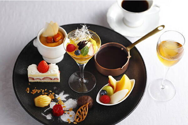 恋姫のショートケーキ、百年紅玉のあたたかい壷チーズケーキ、季節フルーツのチョコレートフォンデュ、プティフールと、ワクワク感いっぱいのデザートを盛り合わせ♪