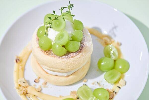 “ぶどう畑のエメラルド”と称される、大粒シャインマスカットが贅沢に使われた『奇跡のパンケーキ 濃密シャインマスカット』(税込1650円)が登場します。