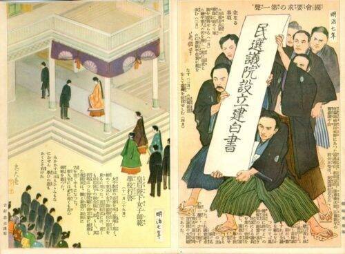 自由民権運動の集大成・民選議院の設立を訴えた志士たち。明治時代の教科書より。