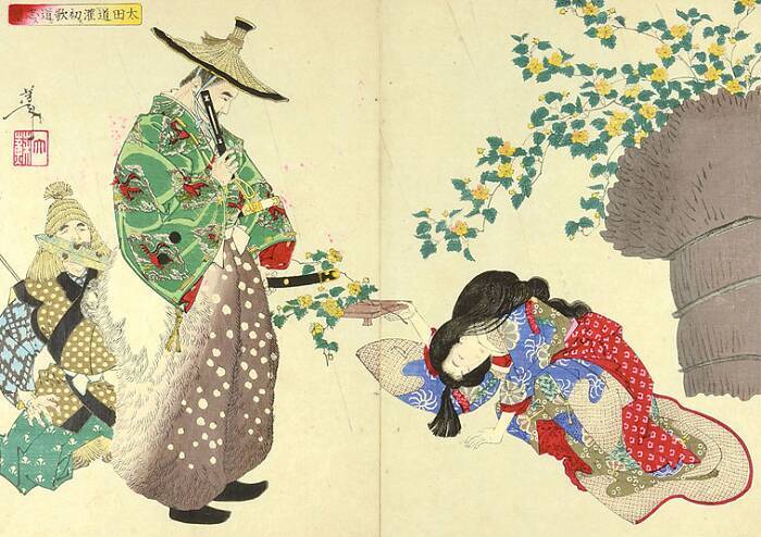 よく判らないまま山吹の枝を受け取った道灌は、結局ずぶ濡れになって帰ったのでした。