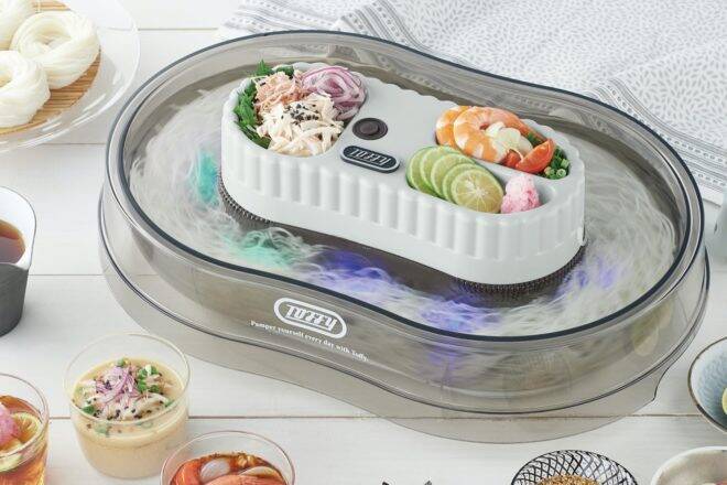 ちょっぴりクラシカルなデザインがステキな「Toffyきらきら流しそうめん器」は、LEDライト付きの流しそうめん器で、底部分に内蔵されたLEDライトが流れるようにキラキラ光り、流しそうめんを華やかに演出してくれるのです。