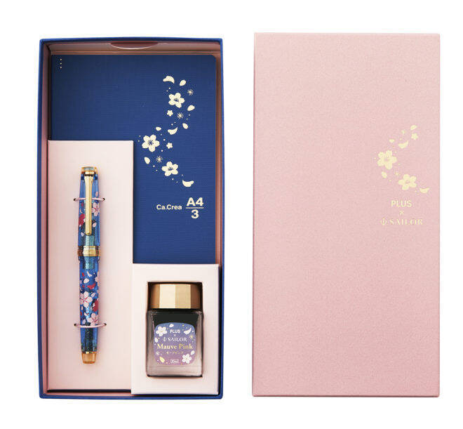 本商品は、プラスとセーラー万年筆によるコラボ企画の第4弾商品で、昨年は第3弾の「桜モチーフ」の桜咲く限定セットが発売されていました。
