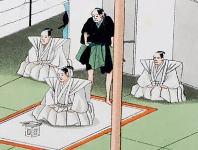 切腹の場に臨む介錯人(黒い人物)。Wikipediaより。