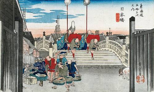 明け六ツの開門と同時に木戸を通過する大名行列。歌川広重「東海道五十三次之内 日本橋」