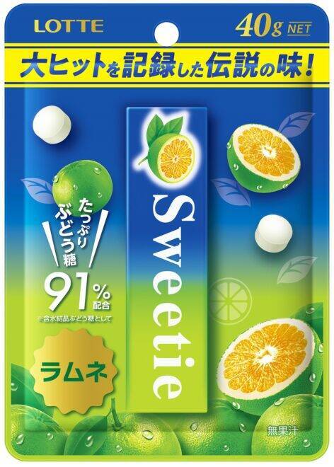 今回発売される「スウィーティラムネ」は、大ヒットを記録した伝説の味「スウィーティガム」の味わいをラムネで再現した商品です。ぶどう糖を91%(含水結晶ぶどう糖として)配合し、なめらかな口どけと香り豊かなスウィーティの味わいが特長です。