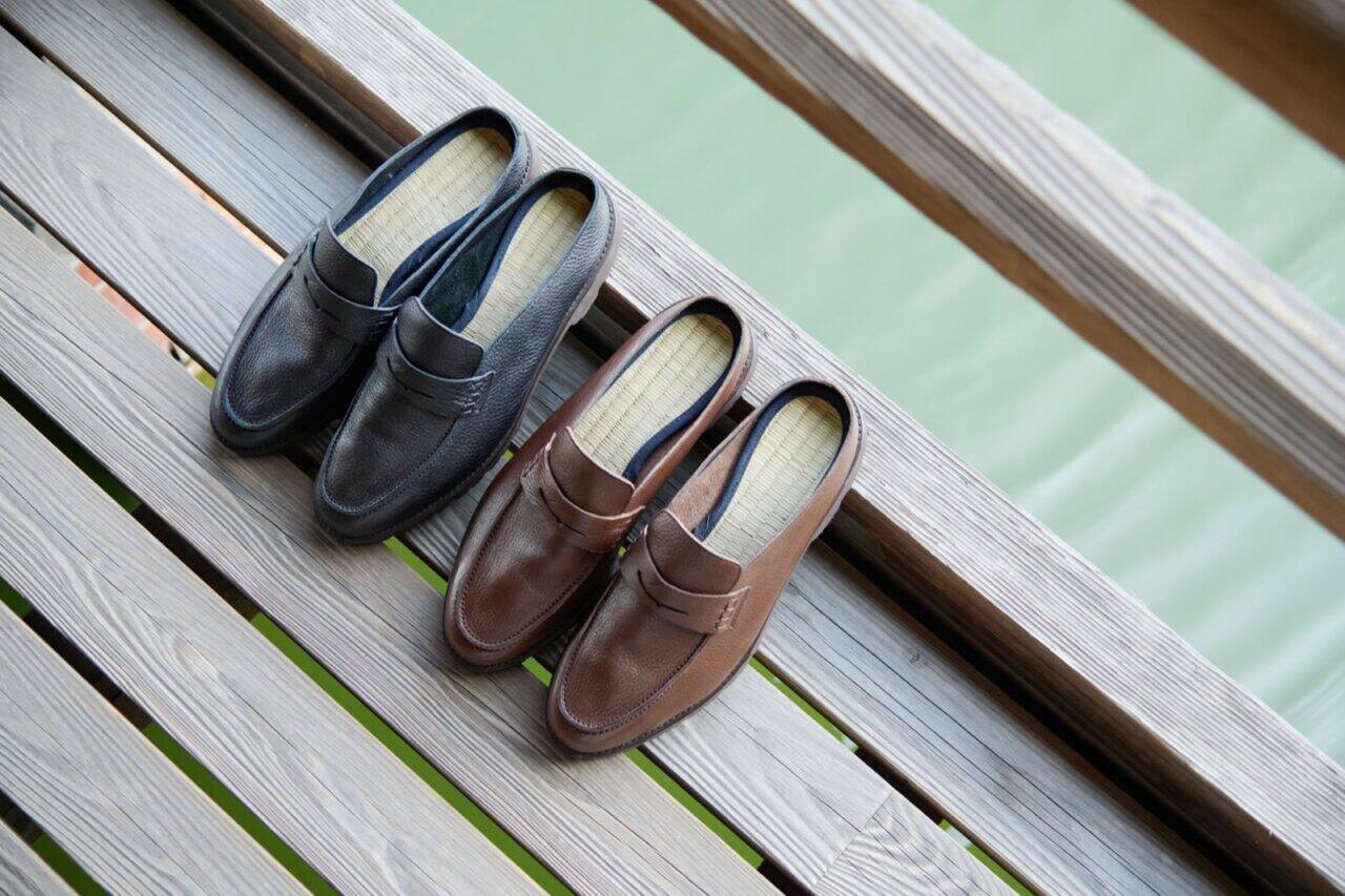 「畳ローファースリッパ」は、吸湿性・吸臭性・抗菌性等に優れた日本の伝統素材・畳(九州産)をインソールに使用したローファーで、さっと足を通すだけで履ける、かかとのない快適なスリッパスタイルとなっています。