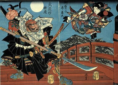 五条大橋で出会った二人(※当時、ここに橋はなかったけど)。歌川芳藤「御曹司牛若丸 武蔵坊弁慶」