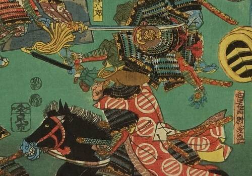 足利義氏を追い駆ける朝比奈義秀。その行く手に立ちはだかる武田父子。歌川豊国「和田合戦図」