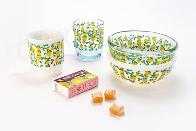 ガラス地に細かいボンタンの総柄プリントを配した、昭和時代の食器を思わせるレトロな雰囲気が漂い、ヴィンテージ感あふれるアイテムに仕上げられていますね。ボンタンアメの伝統的ともいえるパッケージデザインがテーブルウェアに見事にマッチしています。