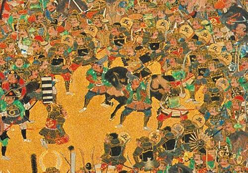 「大坂夏の陣図屏風」より、家康の周囲に控える使番たち(五の印を背負っている)。この中に、鎮目惟明がいたかも。