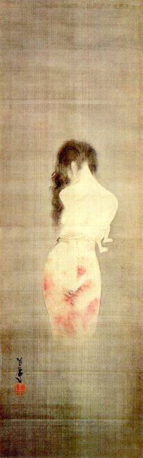 後ろ姿が艶めかしい幽霊は「産女(うぶめ)」という名の妖怪。妊婦が亡くなると妖怪になり、血染めの腰巻きを身につけ、子どもを抱いて現れると言われていました。姑獲鳥とも表記されます。