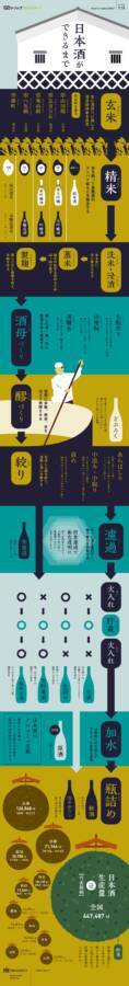 日本酒ができるまでがシンプルに図解されています。日本酒を仕込む工程と種類がとってもわかりやすく説明されているので、日本酒を選ぶときに参考になります。