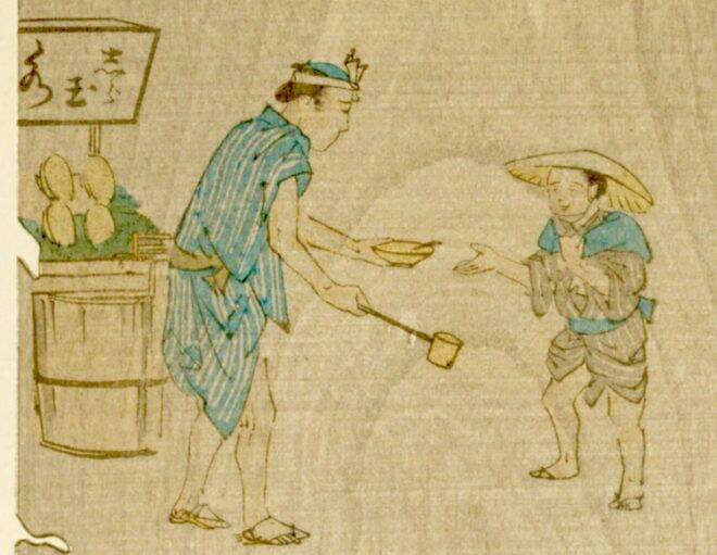 この浮世絵では男性の手に「白玉入り冷や水」が見え、白玉といっても白いものだけではなく、紅で色づけされているものも入っています。他の浮世絵でも赤や黄に彩られた白玉が見られ、とてもカラフルで涼やか。ただの甘い水よりも飲みたくなります。