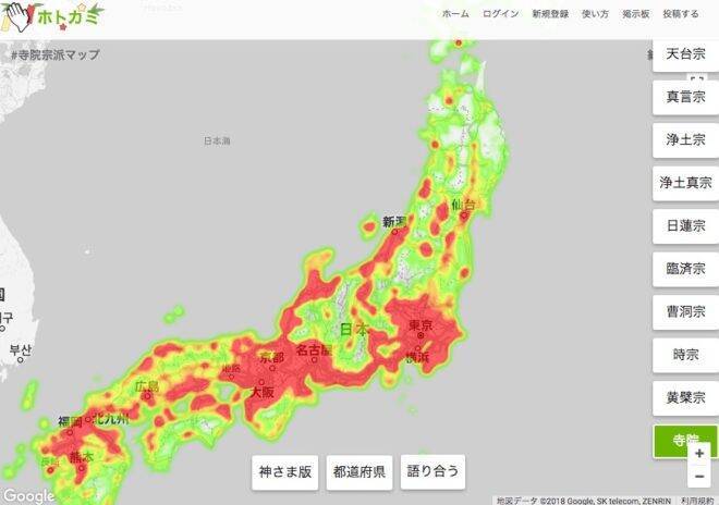 「寺院宗派マップ」は神さまマップと同様にサーモグラフィーのようなグラフィックで、全国の宗派の分布を可視化したサービス。