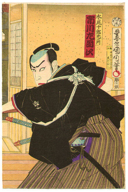 水野十郎左衛門(初代 市川左團次、『極付幡随長兵衛』部分、豊原国周、1884年)Wikipediaより