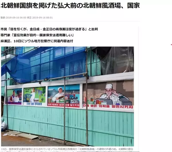 「弘益大学前では、北朝鮮の金日成(キム・イルソン)・金正日(キム・ジョンイル)父子の肖像画を外壁に描いた『北朝鮮式飲食店』が開業に向け準備中だ。日本の木造建築物をまねて作った2階建ての有名日本式飲食店が最近の反日ムードで閉店した場所だ」