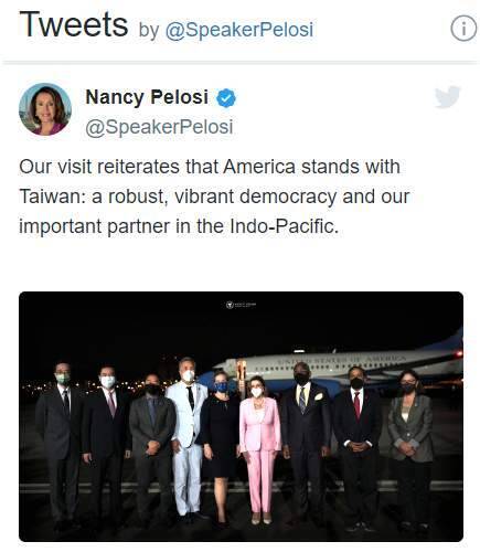 台湾を訪問したペロシ下院議長ら一行の記念写真(ペロシ下院議長の公式ツイッターより)