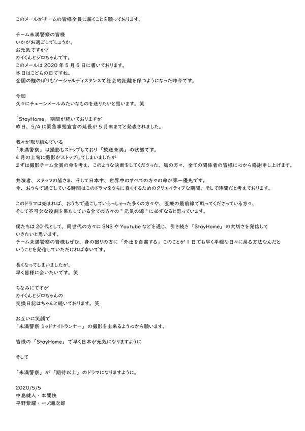 そんな先行き不安な5月上旬。平野は中島と連名で、ドラマ関係者たちにメールを送っている。