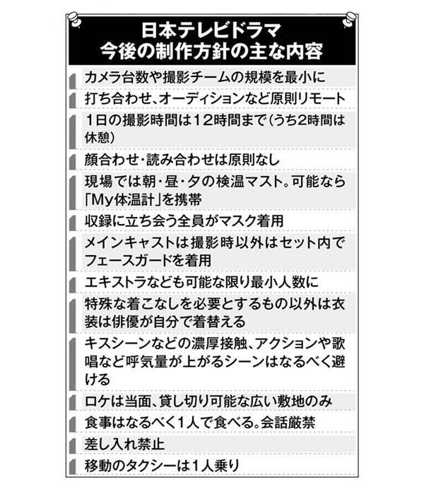 その内容は「カメラ台数や撮影チームの規模を最少に」「1日の撮影時間は12時間まで(うち2時間は休憩)」「収録に立ち会う全員がマスク着用」「メインキャストは撮影時以外はセット内でフェースガード着用」「キスシーンなどの濃厚接触、アクションや歌唱など呼気量が上がるシーンはなるべく避ける」など多岐にわたる。
