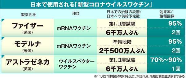 数量に関しても、従来型のワクチンと異なり、合成が簡単で大量生産できるという。政府はファイザー、モデルナ、アストラゼネカの3社から合計1億4,000万人ぶんのワクチンを調達する予定だ。