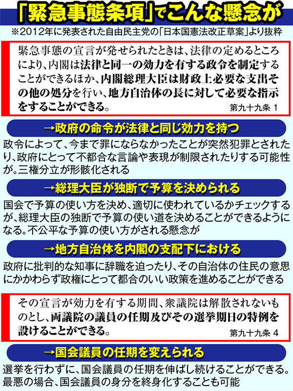 緊急事態条項とは、戦乱や大規模な災害時などの緊急事態に、政府の権限を大幅に強めたり、国会議員の任期を延長したりすることを可能にするもの。現在、東京都や大阪府に出ている「緊急事態宣言」とはまったく異なるものだ。自民党が2012年に発表した「日本国憲法改正草案」や、2018年に発表した「改憲四項目」にも盛り込まれている。