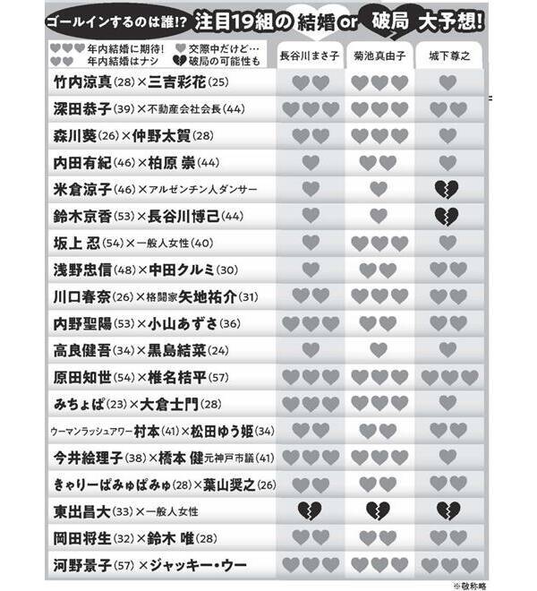 いまだ長引くコロナ禍だからこそ今年も明るいニュースがほしい! そこで、交際が噂される注目カップルの’22年を、芸能リポーターの長谷川まさ子さん、菊池真由子さん、城下尊之さんに予想してもらった。