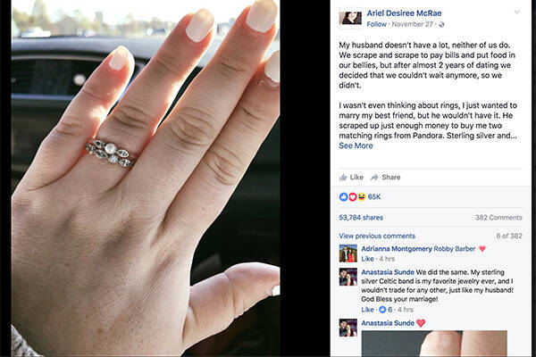彼女の“指輪物語”は多くの人の共感を呼び、65,000回を超えるリアクションを得ている。「なんて素敵なストーリー」「身の丈に合うものを選択したことはとても賢い」といったコメントや、「私の指輪も見て」「私のは25ドルだったのよ」とシルバーやジルコニアの指輪の写真が次々寄せられている。